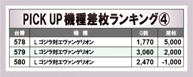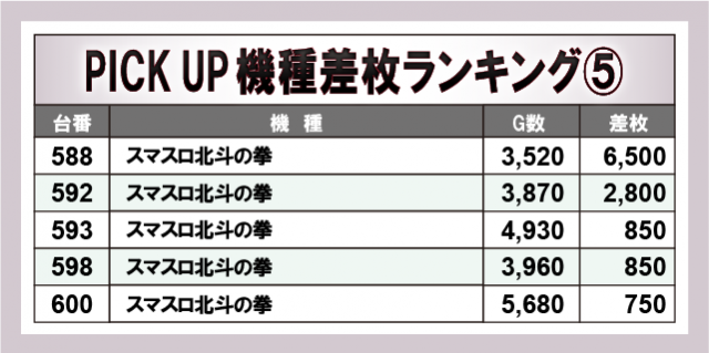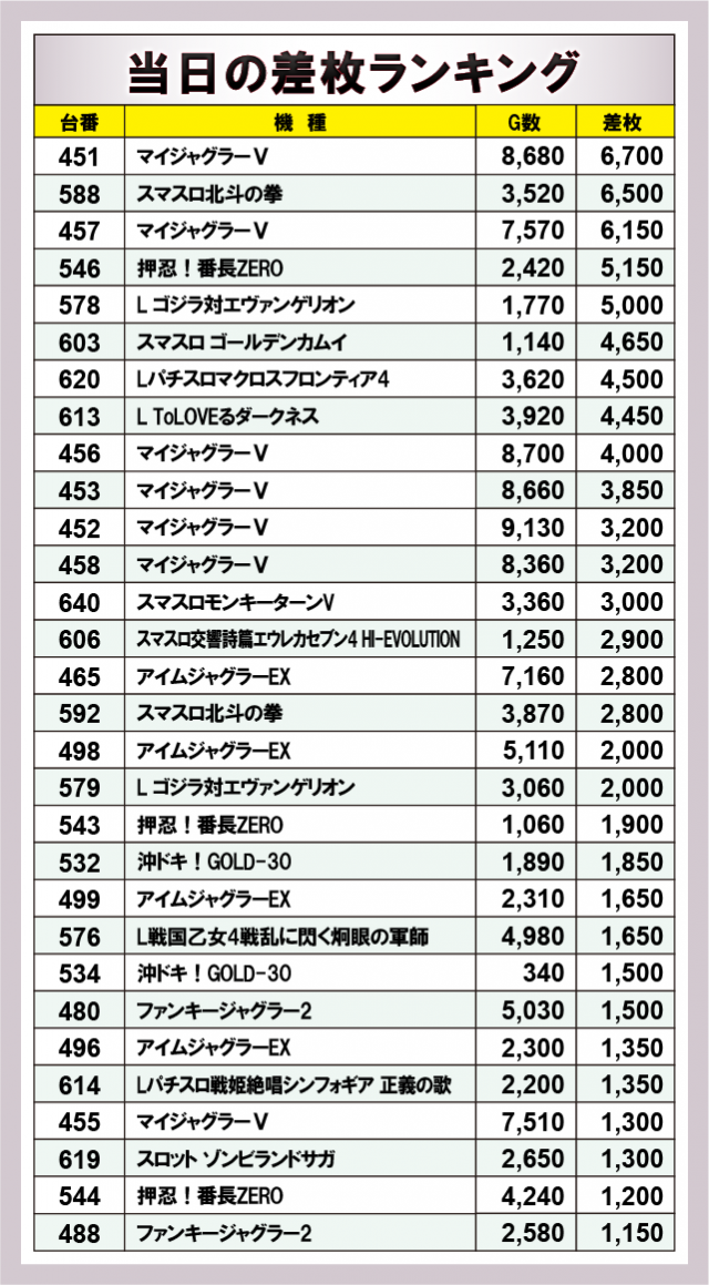 上表の通り、この日のトップ差枚数を叩き出したのは、『マイジャグラーⅤ』で+6,700枚を記録!さらに、『スマスロ北斗の拳』で+6,500枚、『押忍!番長ZERO』で+5,150枚をマークするなど、スペック問わずあらゆる機種にチャンスが眠っていた様子が窺える。
