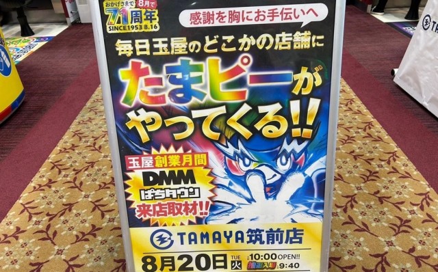 8月20日、玉屋創業71周年を記念した玉屋×DMMぱちタウンのコラボ企画「たまピー来店取材」が『玉屋筑前店』にて実施された。今回が3度目の実施となったわけだが、過去2回ではしっかり結果を残しているだけに、この日朝から駆けつけたファンは大きな期待感を抱いていたのが印象に残る。同店もまた、彼らの想いに応えようと意気込んでおり、開店前にして盛り上がる予感がしていた。さっそく以下から出玉詳細データとともに、当日の店内の様子に迫っていこう!