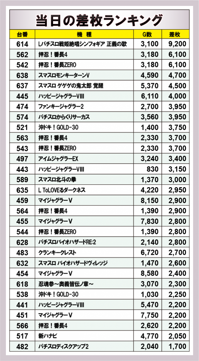 上表の通り、『Lパチスロ戦姫絶唱シンフォギア 正義の歌』+9,000枚OVERを筆頭に、『押忍!番長4』『押忍!番長ZERO』で+6,000枚OVERと気を吐き、この他にも4桁プラス台が多く生まれており、あらゆる機種にチャンスがあったと言えよう。