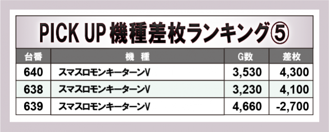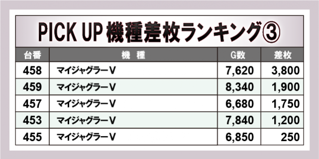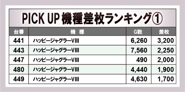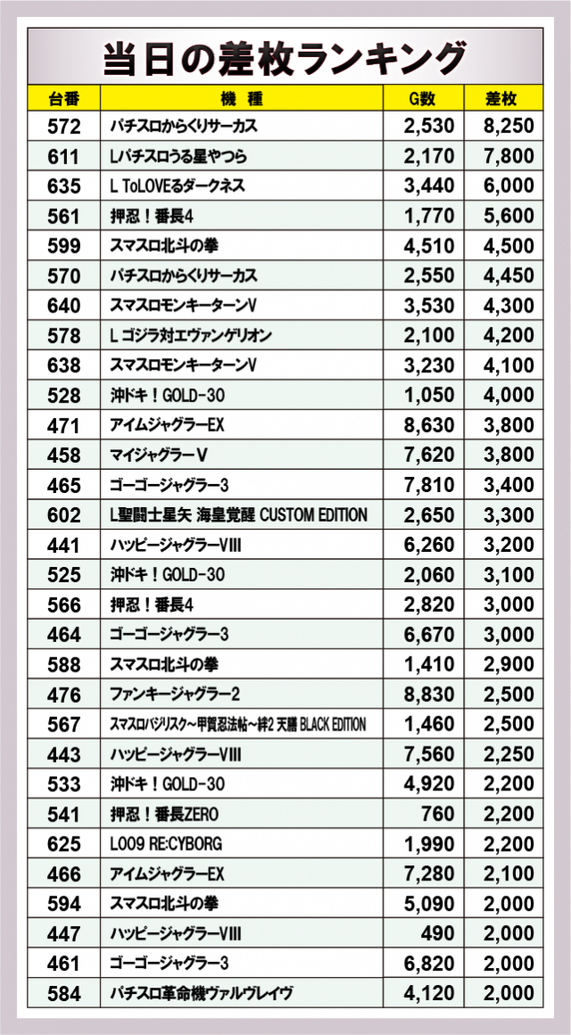 続いて優秀機種に目を向けると、老若男女問わず大人気の『ジャグラー』シリーズから『ハッピージャグラーVⅢ』『ゴーゴージャグラー3』『マイジャグラーⅤ』の活躍が目立っており、各シリーズ+3,000枚OVER台を筆頭に4桁プラス台が続出!また、『押忍!番長4』『スマスロモンキーターンV』も好調台が複数発生し、遊技していたファンは手応えを感じていたに違いない。