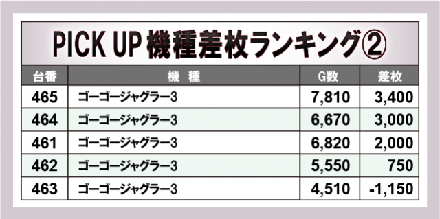 『パチスロからくりサーカス』から+8,000枚OVERが発生。さらに、『Lパチスロうる星やつら』から+7,000枚OVER、『L ToLOVEるダークネス』から+6,000枚OVERをマークするなど、スマスロ機の活躍が目立っていた。また、『ジャグラー』シリーズも多数ランクインしており、幅広い機種にチャンスがあったことが窺える。