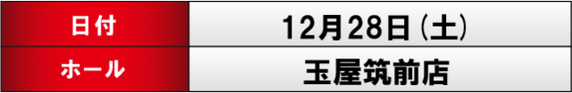 今年も残り僅かとなる12月28日、『玉屋筑前店』にて「たまピー来店取材」が実施された。この日は玉屋全店一斉実施でもあり、ファンは開店時間となるその瞬間を待ちわびていたのが印象に残る。同店もまたファンを笑顔にしようと気概に満ちており、盛り上がる予感を抑えきれなかった。果たしてどのような展開を繰り広げられたのか…さっそく以下から、出玉詳細データとともに当日の様子をお伝えしていくぞ!