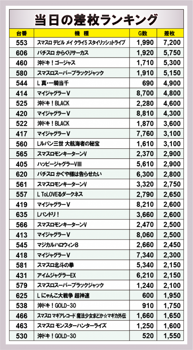 この日のトップを飾ったのは『スマスロ デビル メイ クライ5 スタイリッシュトライブ』で+7.200枚をマーク!次いで『パチスロ からくりサーカス』『沖ドキ!ゴージャス』『スマスロスーパーブラックジャック』が5,000枚OVERを達成している。また2台の4,000枚OVERをマークした『マイジャグラーⅤ』を筆頭にメダル機も負けておらず、各所でファンが手応えを感じていた様子が窺えた。