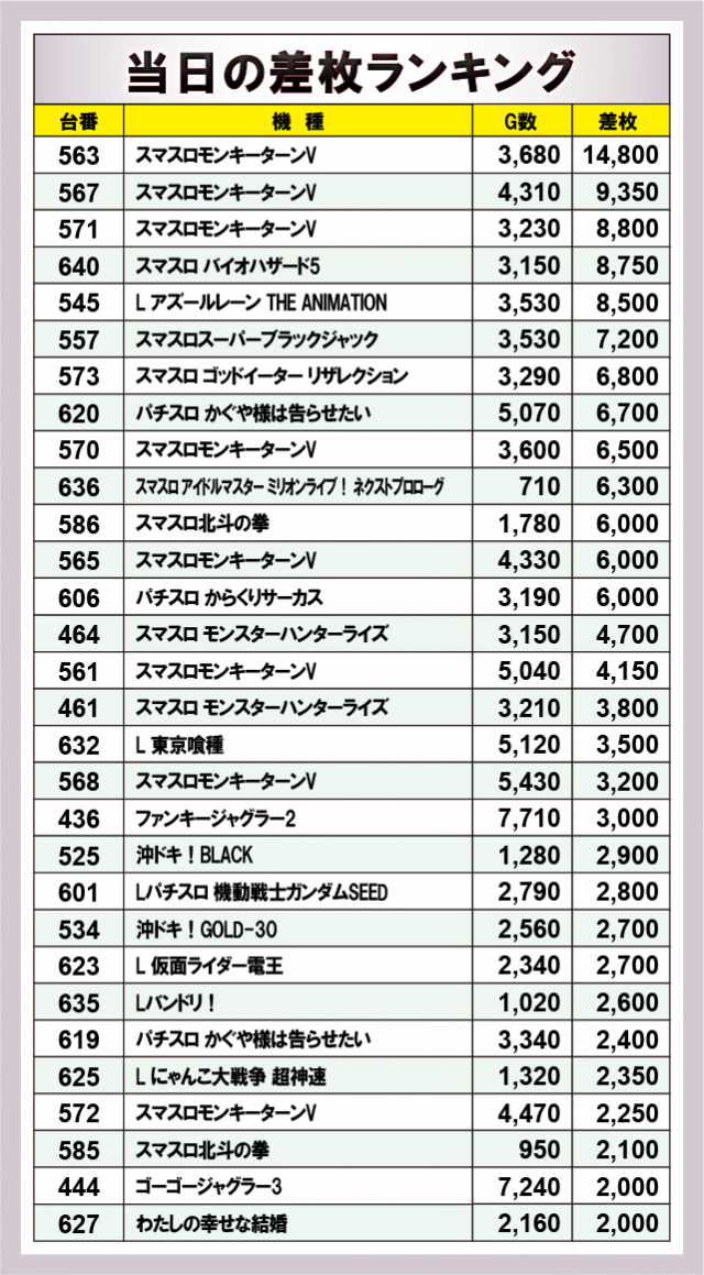 この日のトップを飾ったのは『スマスロモンキーターンV』で+14,800枚をマーク!さらに+9,350枚・+8,800枚と続き、トップ3を同機種が独占!そのしたには『スマスロ バイオハザード5』『L アズールレーン THE ANIMATION』『スマスロスーパーブラックジャック』など人気機種や新台が続くほか、『ファンキージャグラー2』や『沖ドキ!GOLD-30』といったメダル機も奮闘していた様子も見逃せない。