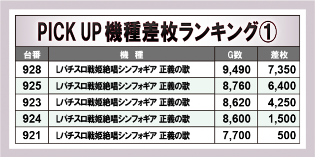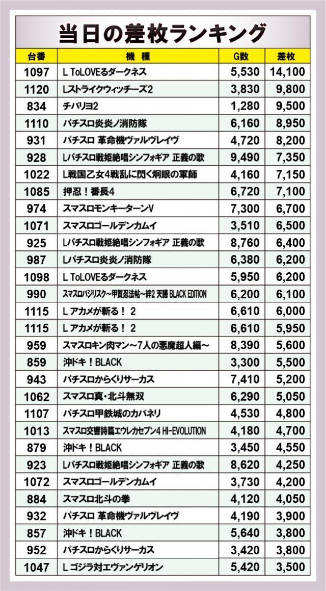 差枚ランキングをチェックしてみると、ピックアップ30台全てが+3,000枚OVERを記録!それらの中でもっとも優秀だったのは、1097番台の『L ToLOVEるダークネス』で+14,100枚をマーク。また、『Lストライクウィッチーズ2』『チバリヨ2』で万枚目前台が存在するなど、様々な機種から大きな熱気が放たれていたのが目に焼きつく。