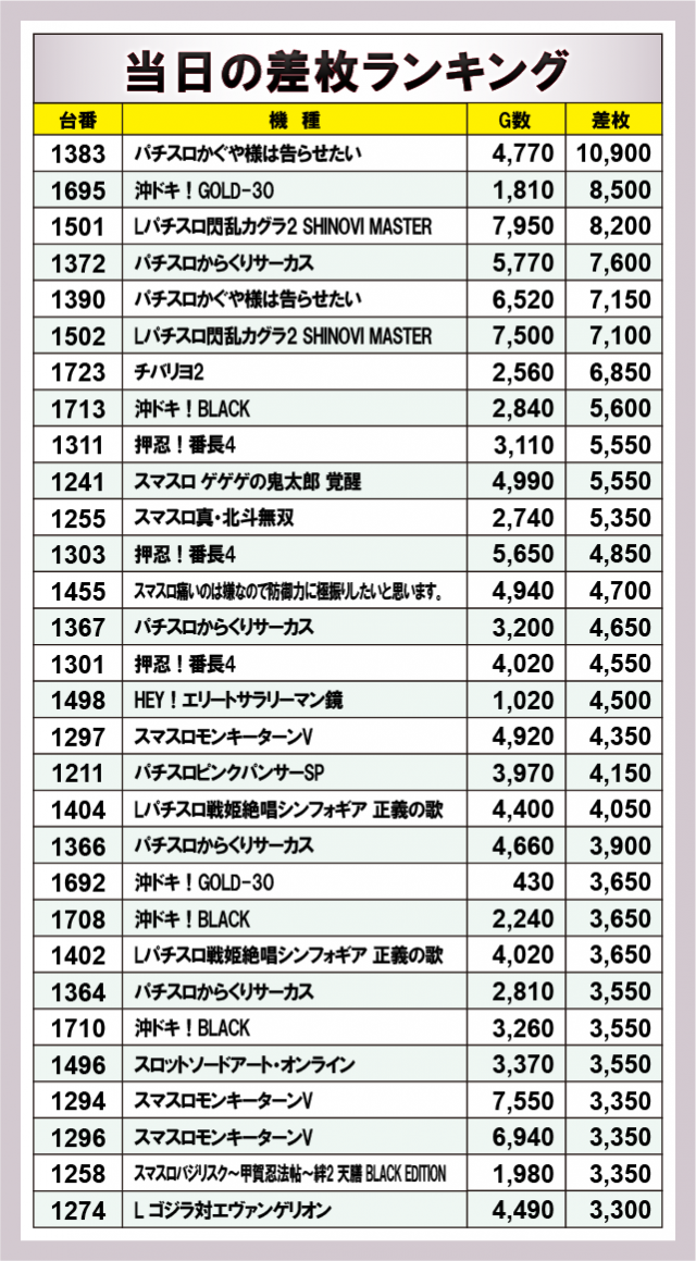※差枚数順に掲載しています。