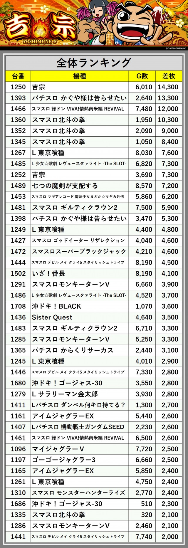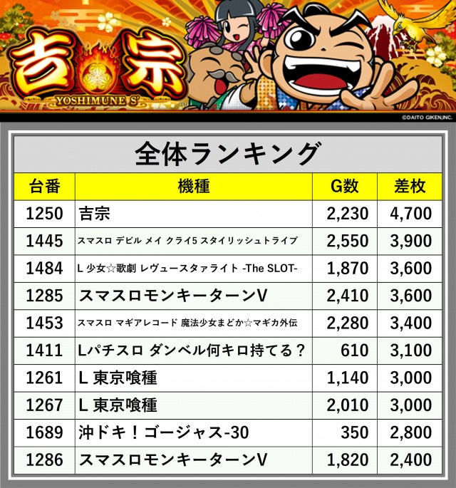厳選された取材対象機種をはじめ、その他スロット全体から好記録が飛び出した!プレイヤーが楽しんだ1日を下記データにて振り返ってみて欲しい。