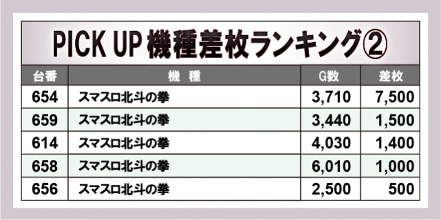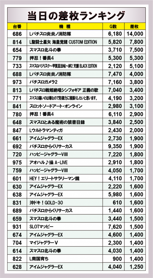 この日トップ差枚を叩き出した『Lパチスロ炎炎ノ消防隊』や、不動の人気機種『スマスロ北斗の拳』で好結果が目立っていた。また『ジャグラー』シリーズの『アイムジャグラーEX』も奮起しており、これらの機種たちが当日の盛り上がりを牽引していたのは間違いなさそうだ!