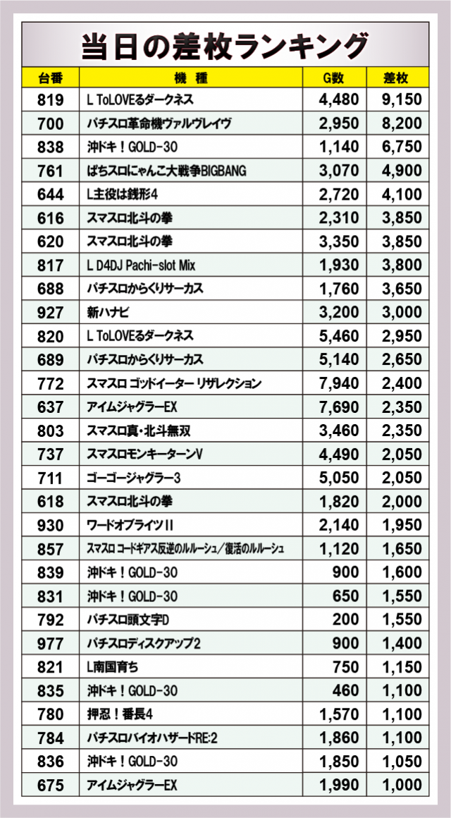 この日は残念ながら万枚OVER台は発生しなかったが、『L ToLOVEるダークネス』+9,000枚OVERを筆頭に、『パチスロ革命機ヴァルヴレイヴ』で+8,000枚OVER、『沖ドキ!GOLD-30』で+6,000枚OVERをマークするなど、スマスロからメダル機までスペック問わずあらゆる機種にチャンスが眠っていた様子が窺える。