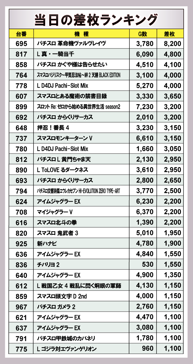 ※差枚数順に掲載しています。