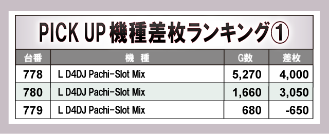 上表の『L D4DJ Pachi-Slot Mix』『パチスロL黄門ちゃま天』『L リングにかけろ1 V』『新ハナビ』『スマスロ頭文字D 2nd』は、いずれも店内に熱気を形成した機種と言える。打ちごたえのある状況が整っていた様子から、ファンにとって叩き甲斐があったと言えるだろう。