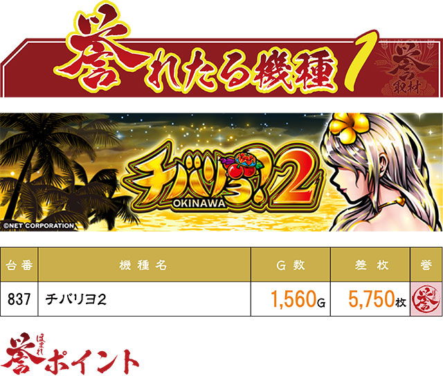 たった3台設置ながら、837番台がこの日の誉ランキング2位という好結果を生み出すことに成功!あまり回されずに放置されていた残り2台の無念をしっかり晴らしてくれた。