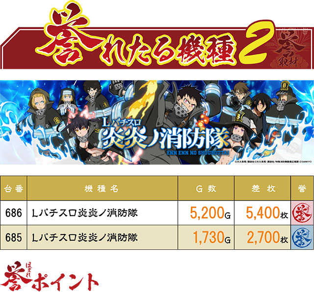 設置4台のうち、半数がプラっていた『Lパチスロ炎炎ノ消防隊』。その2台ともが2,500枚以上を記録しており、ともに好挙動を示していたようだ。