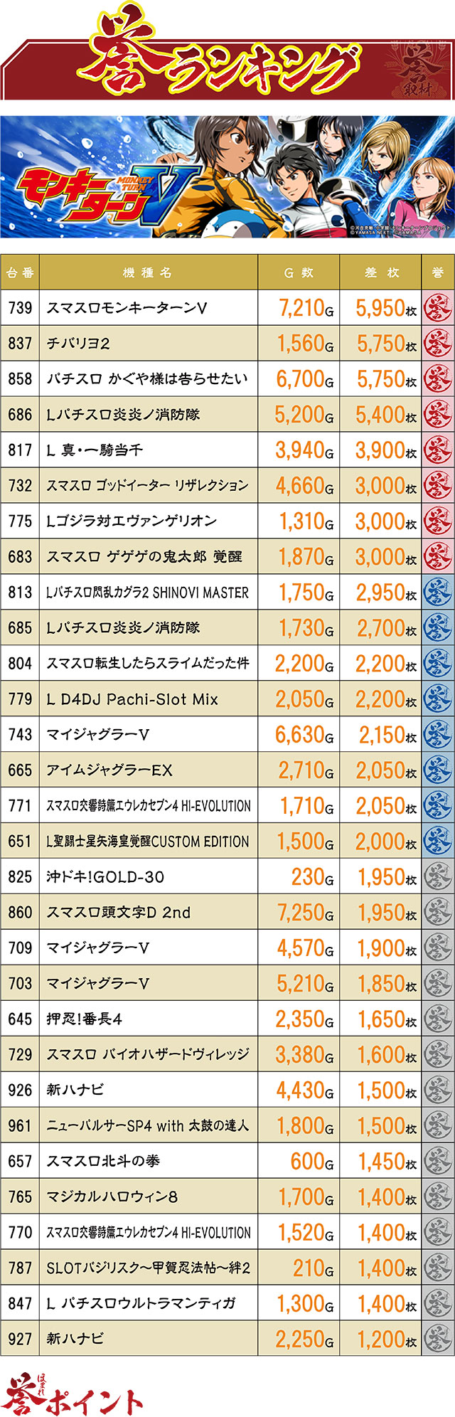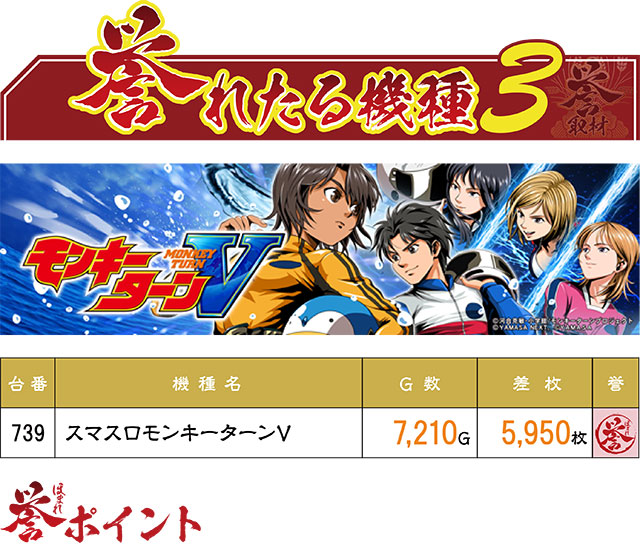 前回と同じく、今回も最高差枚記録を叩き出したのは『スマスロモンキーターンV』。それも全く同じ739番台が連続首位レコードというのだから驚きを隠せない。またランクインしたのはメイン機種だけではなく、『チバリヨ2』『L 新・一騎当千』『Lパチスロ閃乱カグラ2 SHINOVI MASTER』『L D4DJ Pachi-Slot Mix』などの機種からも好結果が生まれていたようだ。