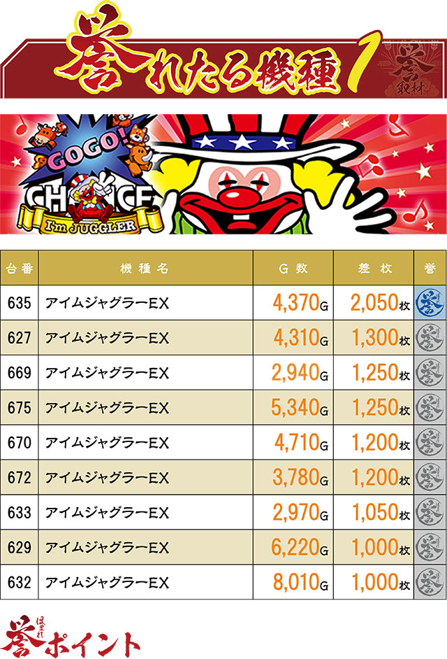 『アイムジャグラーEX』コーナーからは、計9台の誉マークが出現。ただし、赤誉マーク(=3,000枚以上)は生まれなかったようで、そこだけが惜しまれる点だったようだ。