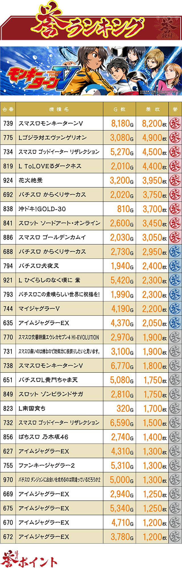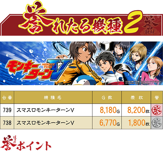 この日の最高差枚レコードを生み出したのは、ご存知『スマスロモンキーターンV』の739番台。2位の記録が5,000枚にも満たないことからも、いかに独走状態だったかが分かるはず。また、今回も少台数マシンが複数ランクインを果たした!
