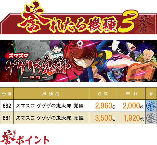 3台中2台が誉マーキングとなった『スマスロ ゲゲゲの鬼太郎 覚醒』。残念ながら赤誉マーク(=3,000枚超え)は叶わなかったが、環境の良さは示すことができたのではないだろうか。