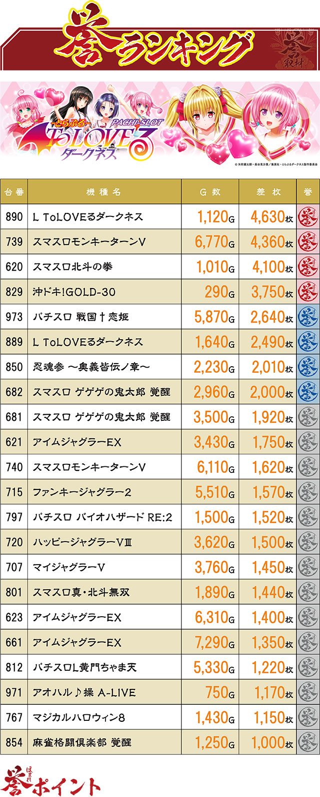 この日の最高差枚スコアは、『L ToLOVEるダークネス』が勝ち取ったものの、その数値は5,000枚に届いておらず、パワー不足を否めない結果となった。それに伴い、赤&青誉マーキングの総数も前回より減少しており、遺恨の残る1日となってしまったかも…。