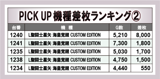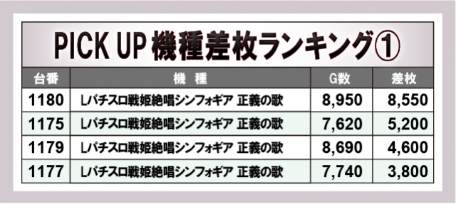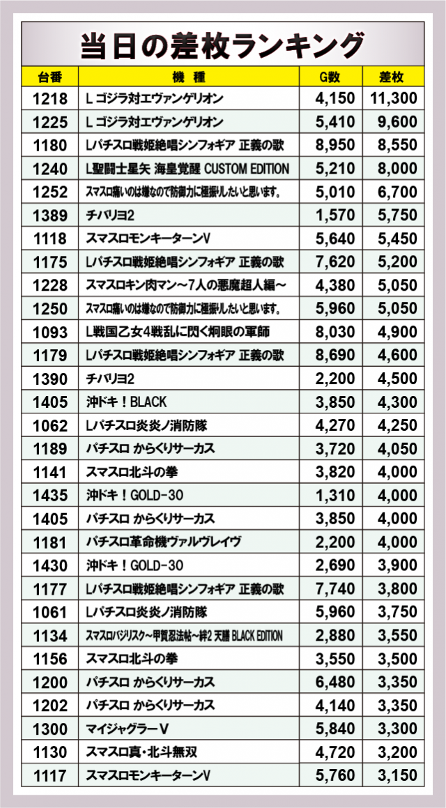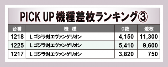 優秀台をチェックしてみると、ピックアップ30台全てが+2,000枚OVERを記録!なかでも、『L ゴジラ対エヴァンゲリオン』1218番台+11,300枚と万枚OVERが存在し、大きな熱気が放たれていたのが目に焼きつく。また、全体を見渡してもスマスロ機を中心に様々な機種が活躍しており、大きく盛り上がっていた様子が窺える。