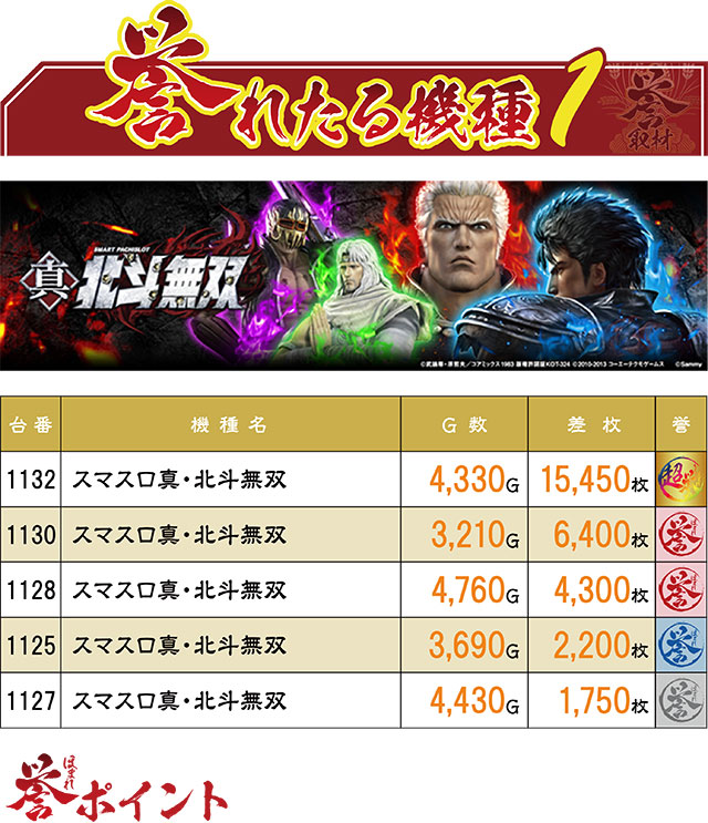 半数以上の台が誉マーキングだった『スマスロ真・北斗無双』。特にこの日唯一の10,000枚超えだった1132番台や、安定した挙動で+4,000枚超えを達成した1130・1128番台などは優秀台の責務をしっかり全うしてくれた。