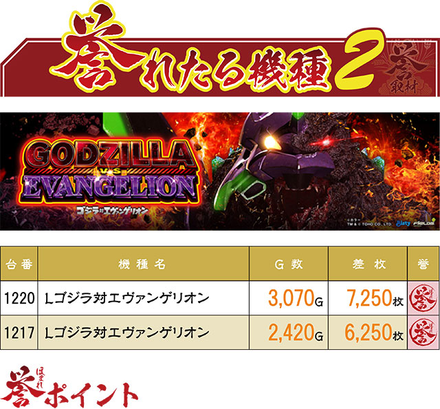 8台中2台が+6,000枚オーバーだった『Lゴジラ対エヴァンゲリオン』。明らかに他の台とは異なる挙動を見せていた2台は、案の定赤誉マークとなり、この日の盛り上がりに拍車をかける存在に。
