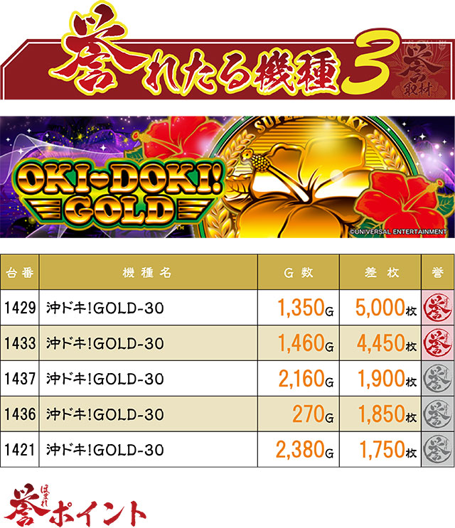 『沖ドキ!GOLD-30』コーナーからも常時軽快な大当りサウンドが鳴り響いていたこの日。頭1つ飛び出す活躍を見せたのは1429番台&1433番台で、ともに+4,000枚を優に上回る結果となった。