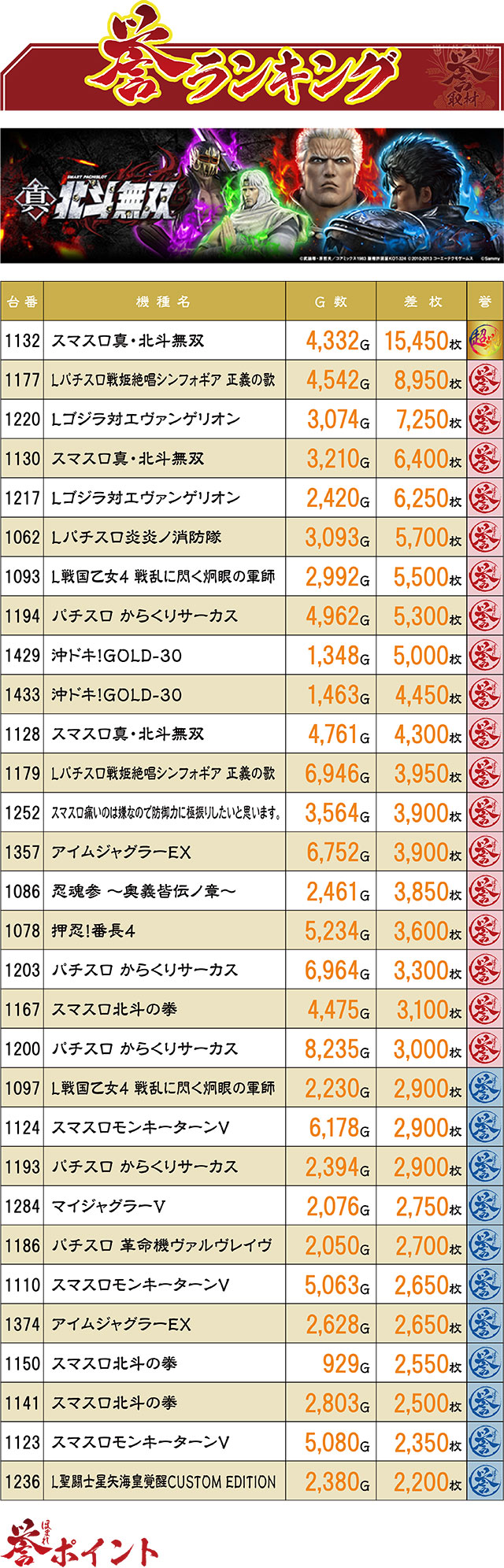 『スマスロ真・北斗無双』が我々の想像以上のポテンシャルを発揮し、+15,450枚の壮絶レコードで首位の座に立った。また同機は4位と11位にもランクイン。人気マシンはいずれも複数台がTOP30記録に名を連ねていることから、やはり人気マシンに優秀台が多く潜んでいたと見るべきだろう。