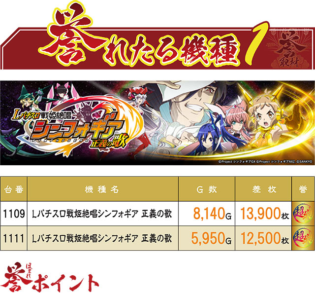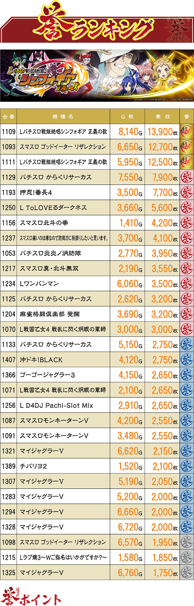 ご覧の通り、この日は+12,000枚オーバー台が3台も!その激しい首位争いを制したのは『Lパチスロ戦姫絶唱シンフォギア 正義の歌』1109番台。なお3位も『シンフォ』がランクイン。またランキングの後半では『マイジャグラーⅤ』が連続ランクインを果たした。