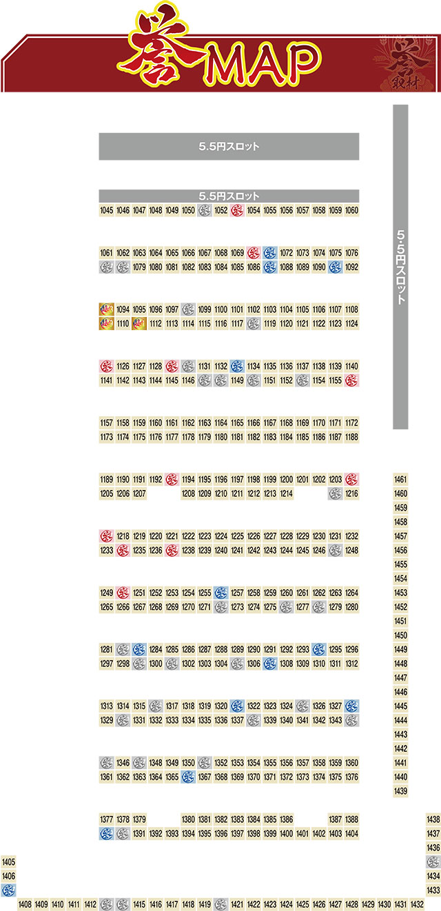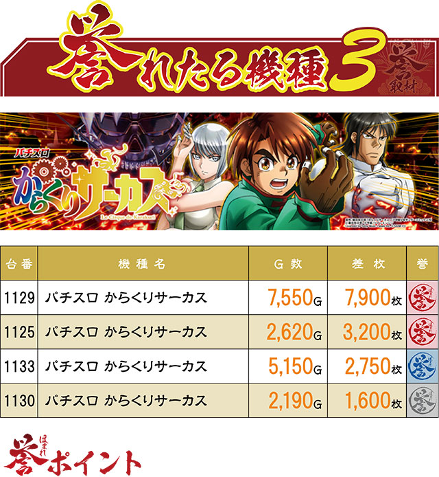 12,000枚を超える結果が3台も出現し、パチスロコーナーを大いに沸かせてくれた今回。先述の通り、『Lパチスロ戦姫絶唱シンフォギア 正義の歌』の活躍がかなり目立つ1日となったようだ。誉MAPに目を向けると、カド台に多くの誉マーキングが付いていることに気づく。その数、12台。これは偶然なのか、それとも…!?