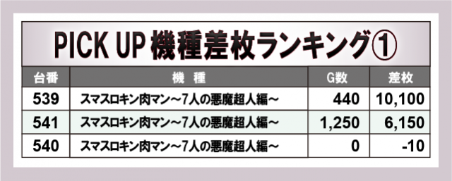突出して目立っていたのはやはり、この日のトップ差枚数を獲得した『スマスロキン肉マン~7人の悪魔超人編~』だ。少ないG数ながらもポテンシャルの高さを秘めており、スマスロ機の圧倒的存在感を示していた。
