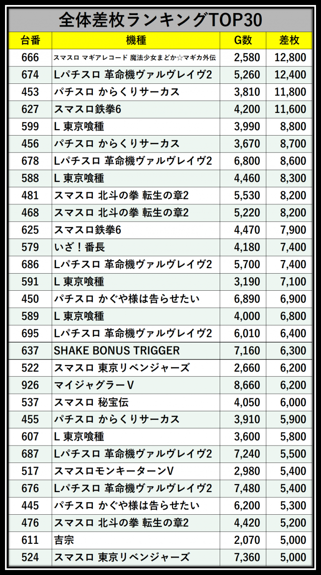 今回の「極誓取材」は、『スマスロ マギアレコード 魔法少女まどか☆マギカ外伝』『Lパチスロ 革命機ヴァルヴレイヴ2』『パチスロ からくりサーカス』『スマスロ鉄拳6』から万枚OVERが飛び出し、店内の盛り上がりをリードする結果となった。また、ランキングTOP30は+5,000枚OVERからとなっており、随所で確かな出玉感を体感していたファンは高揚感を抑えきれなかったことだろう。機種別でみても、エリア単位で結果がまとまっている場面も多く、立ち回り次第でチャンスを掴める余地は十分に感じられた。この流れが今後も続くのか、引き続き注視したい!