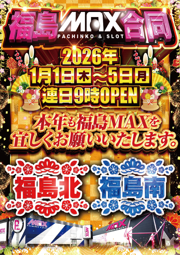今年”も”あの新台もこの新台も『毎日どこよりも楽しさMAX』でお届けいたします!2026年1月5日月曜日 MAX福島南
