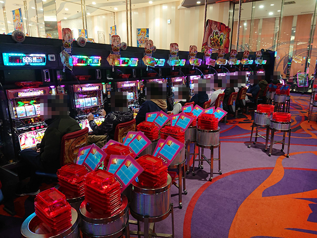 「沖ドキ!2-30」や「SLOTバジリスク~甲賀忍法帖~絆2」、「押忍!番長3」をはじめ、さまざまな機種がにぎわっているといったイメージです。