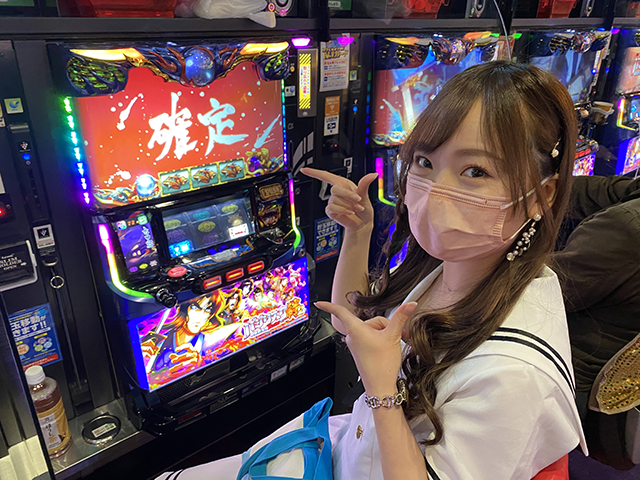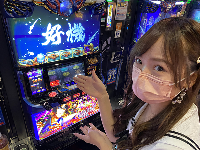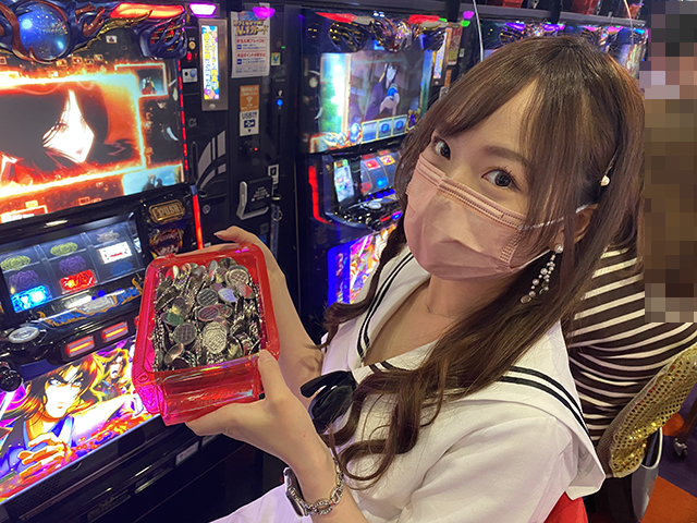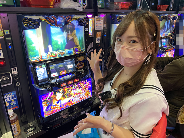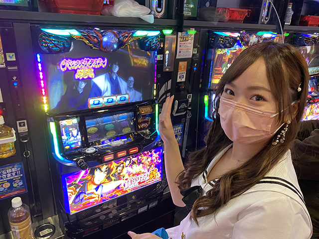 まみちゃんはパチスロの「SLOTバジリスク~甲賀忍法帖~絆2」を選び、気合い十分で実戦をスタートしました。