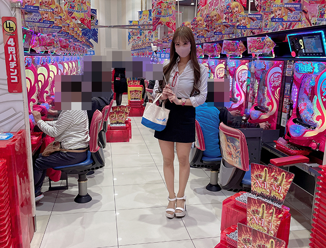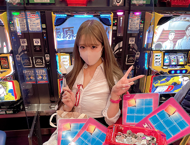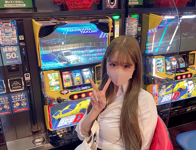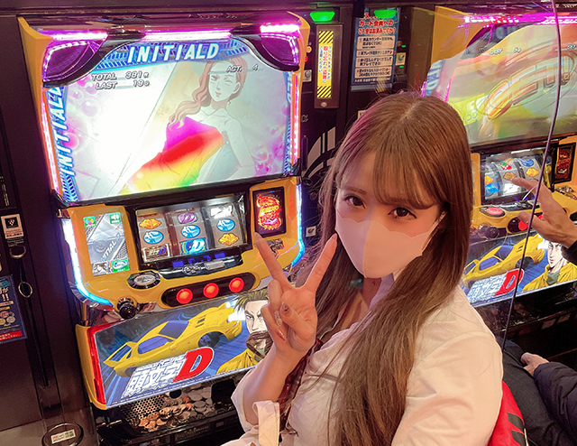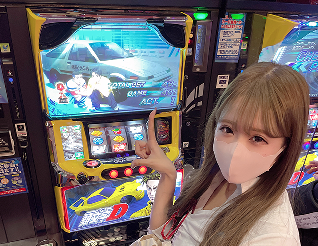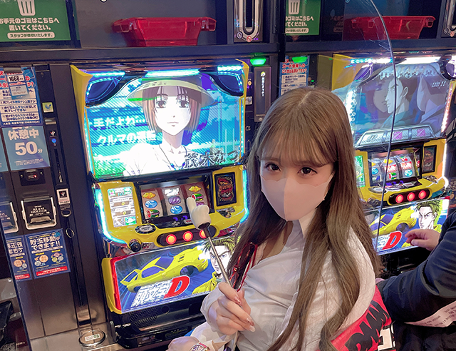 今回は女教師風のコスチュームに変身して、「パチスロ頭文字D」で実戦開始!!