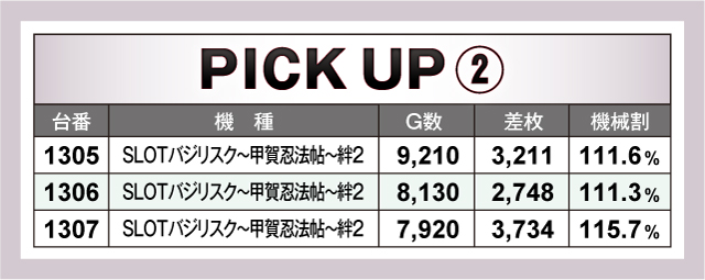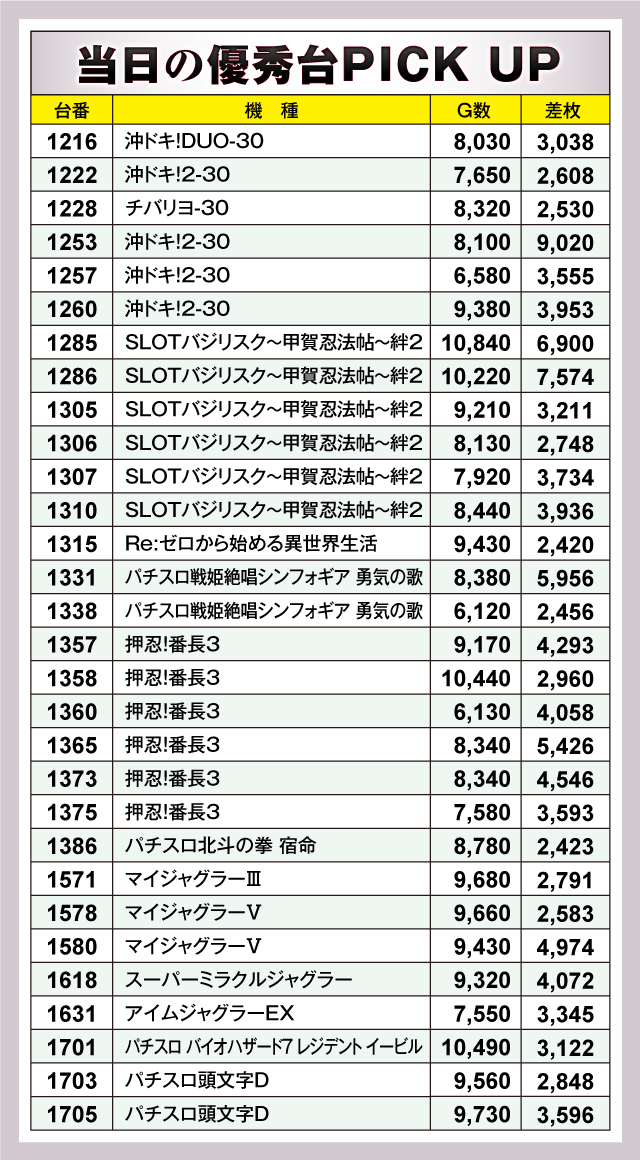 優秀台を見てみると、差枚+9,020枚を叩き出した『沖ドキ!2-30』を筆頭に、『SLOTバジリスク〜甲賀忍法帖〜絆2』からは+7,574枚の1286番台、+6,900枚の1285番台が続く。さらに+5,956枚の『パチスロ戦姫絶唱シンフォギア 勇気の歌』1331番台、+5,426枚の『押忍!番長3』1365番台などの活躍が目立った。