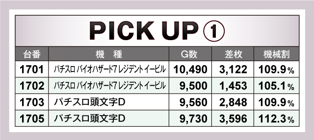 ピックアップ機種では、『パチスロ バイオハザード7レジデント イービル』、『パチスロ頭文字D』、『SLOTバジリスク〜甲賀忍法帖〜絆2』が期待に応えていた。
