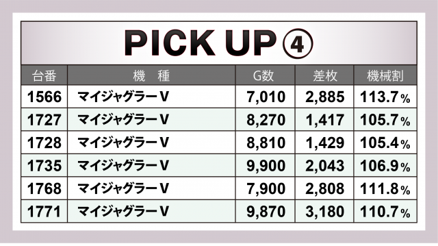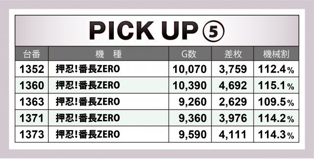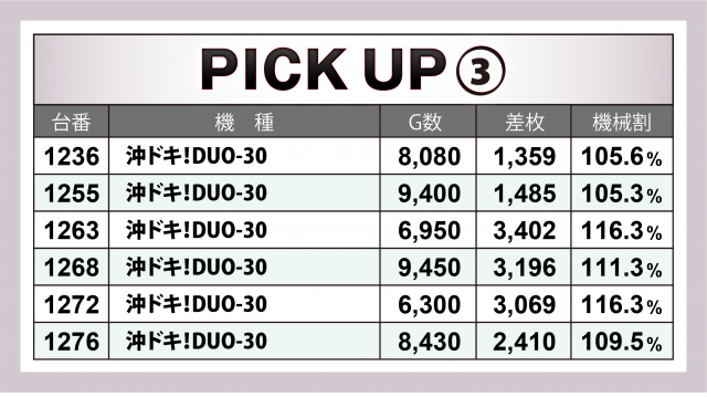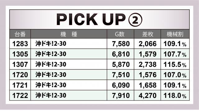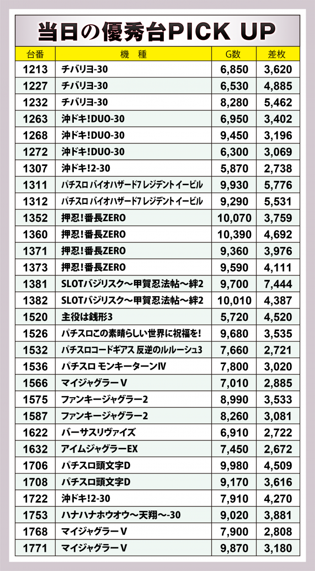 まずは優秀30台のPICK UPから。30台全てが差枚数+2千枚以上、うち24台が+3千枚以上、さらに11台が+4千枚以上となった。また後述する好調6機種以外では、2台合計で+1万1千枚を突破した『パチスロ バイオハザード7 レジデント イービル』・取材日に導入開始したての『パチスロ頭文字D』が同じく2台トータルで+8千枚を超え、その好成績が光った。