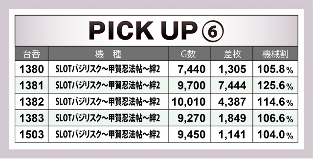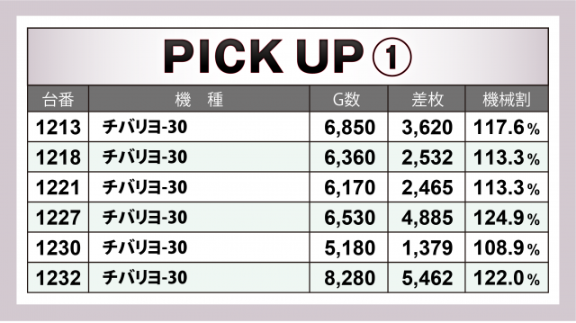 続いてはこの日の好調6機種計34台。6機種全てがそれぞれ合計差枚数+1万枚以上を記録し、最も優秀だったのが『チバリヨ-30』。6台トータルで+2万枚を突破! さらに続いたのが『押忍!番長ZERO』で、5台トータルで+1万9千枚超&1台あたりの平均は+3千8百枚オーバー!