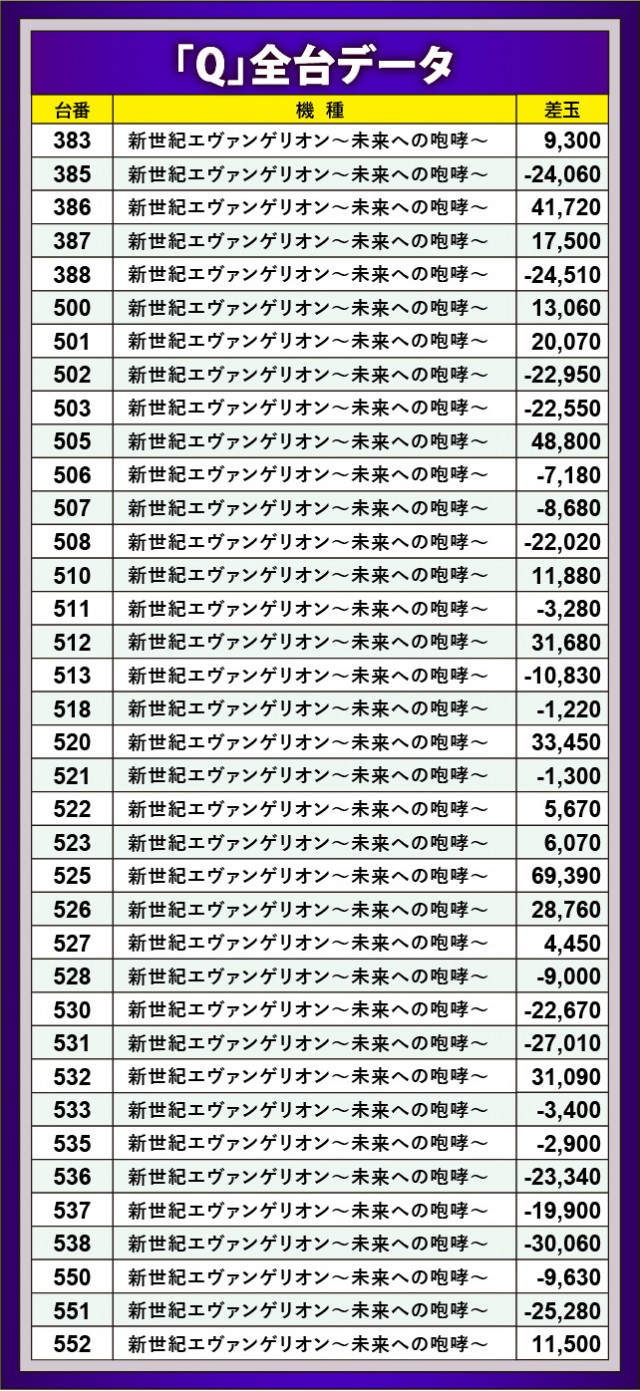 前回の「ヒーローズレポート」では複数の6万発OVERが発生していた。そして今回も『新世紀エヴァンゲリオン〜未来への咆哮〜』にて、525番台+69,390玉という鮮烈な記録が誕生している。惜しくも7万発に届かなかったが、他の台でも4万発OVERを確認でき、やはり同店の同機種には凄まじいポテンシャルが秘められているのだと実感せざるを得ない。