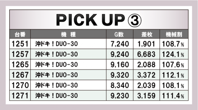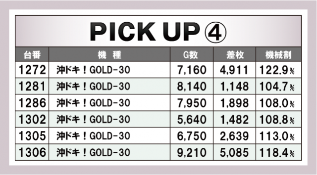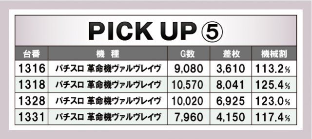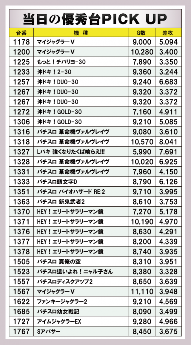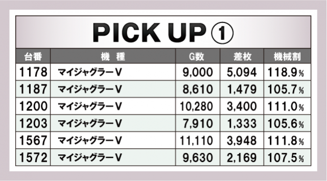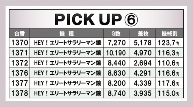 今回のピックアップは計6箇所。先述した機種だけでなく、ジャグラーシリーズもぬかりないデータが挙がっている。『マイジャグラーⅤ』の優秀台はピックアップ①と②に列挙してあるので気になる方はチェックしておこう。また、『HEY!エリートサラリーマン鏡』の優秀台は6台全てが機械割110%オーバー。『鏡』の設定5は110.6%あるので、その全てが高設定であっても過言はないだろう。