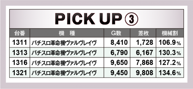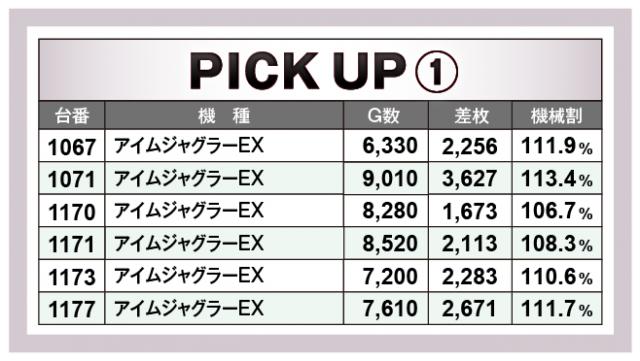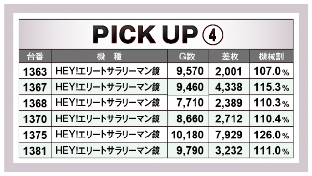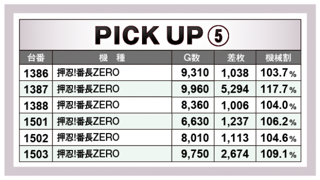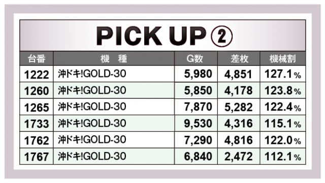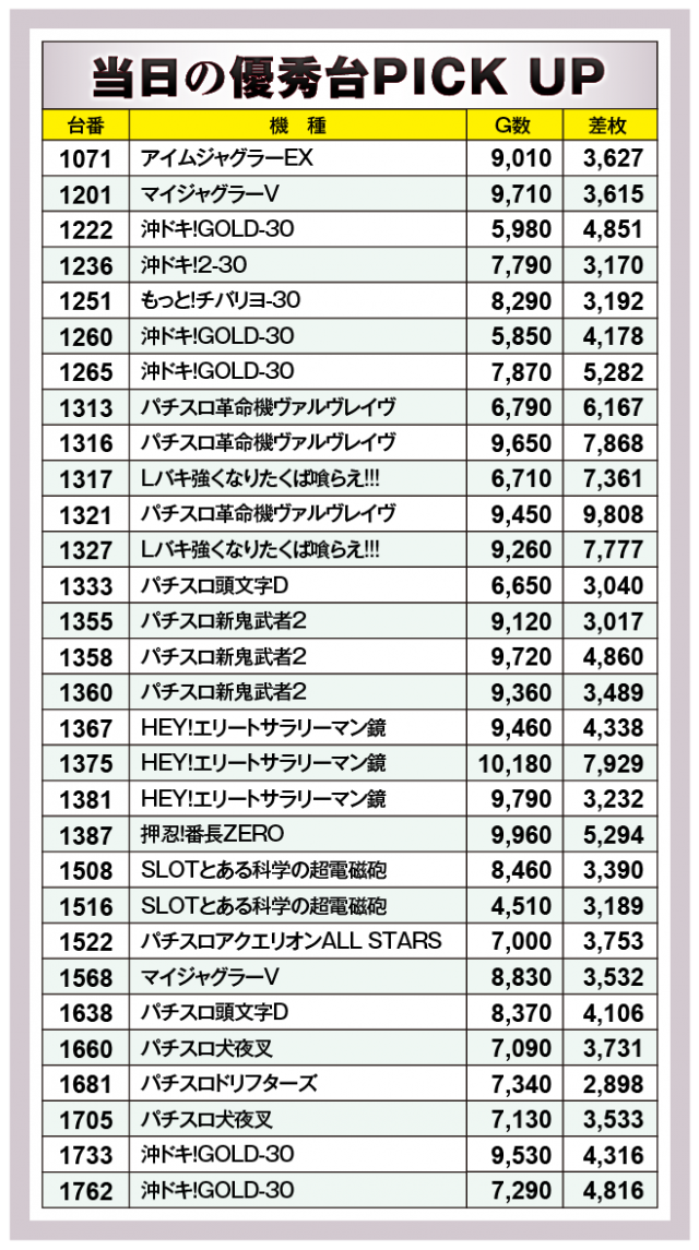 続いては好調5機種をチェック。この好調5機種が優秀30台のPICK UPをほぼ占める形となったわけだが、中でも特に優秀だったのが『沖ドキ!GOLD-30』でピックアップ6台のうち5台が+4千枚以上を記録し、6台のトータル差枚数は+2万5千枚オーバーを獲得した!また『パチスロ革命機ヴァルヴレイヴ』では4台のトータル差枚数が+2万5千枚オーバー、『HEY!エリートサラリーマン鏡』では6台のトータル差枚数が+2万2千枚オーバーをマークし、スマスロ機の威力を存分に見せつけていた。その他では『アイムジャグラーEX』『押忍!番長ZERO』の2機種でもドル箱使用台が目立ち、人気機種のポテンシャルの高さが窺える結果となった。