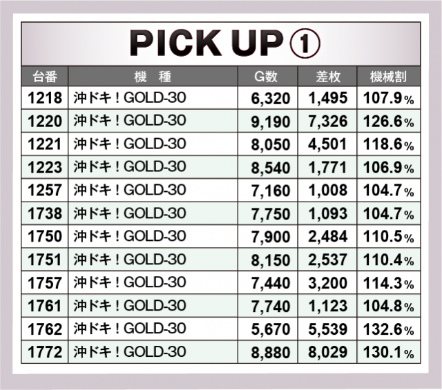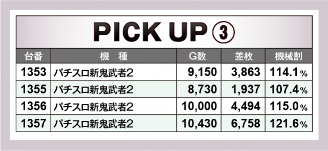 続いては当日好調だった4機種について。まず目を引くのが『沖ドキ!GOLD-30』で、1772番台の+8,029枚を筆頭に12台のトータル差枚数は+4万枚オーバーを記録し、島全体が活気に満ち溢れていたのが印象的だ。次いで、『パチスロ甲鉄城のカバネリ』と『パチスロ新鬼武者2』で共に+6千枚オーバー台が発生し、さらに万回転を記録する台も出現!消化されたゲーム数の多さから、満足度の高い遊技を味わえたのではないだろうか。そして『HEY!エリートサラリーマン鏡』では1378番台の+9,395枚を筆頭に5台の好調台が光っていた。
