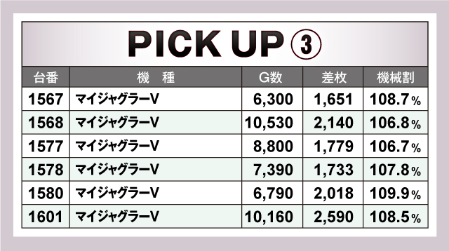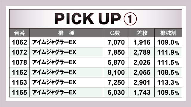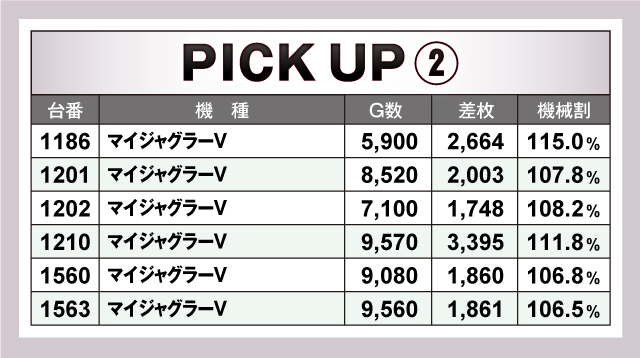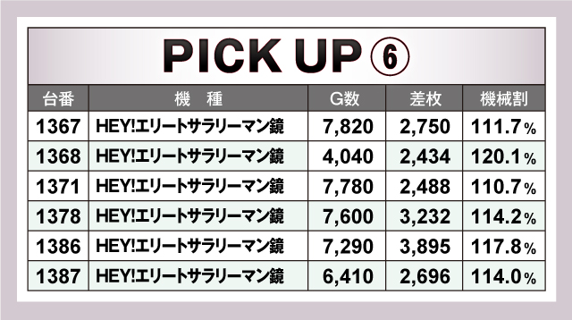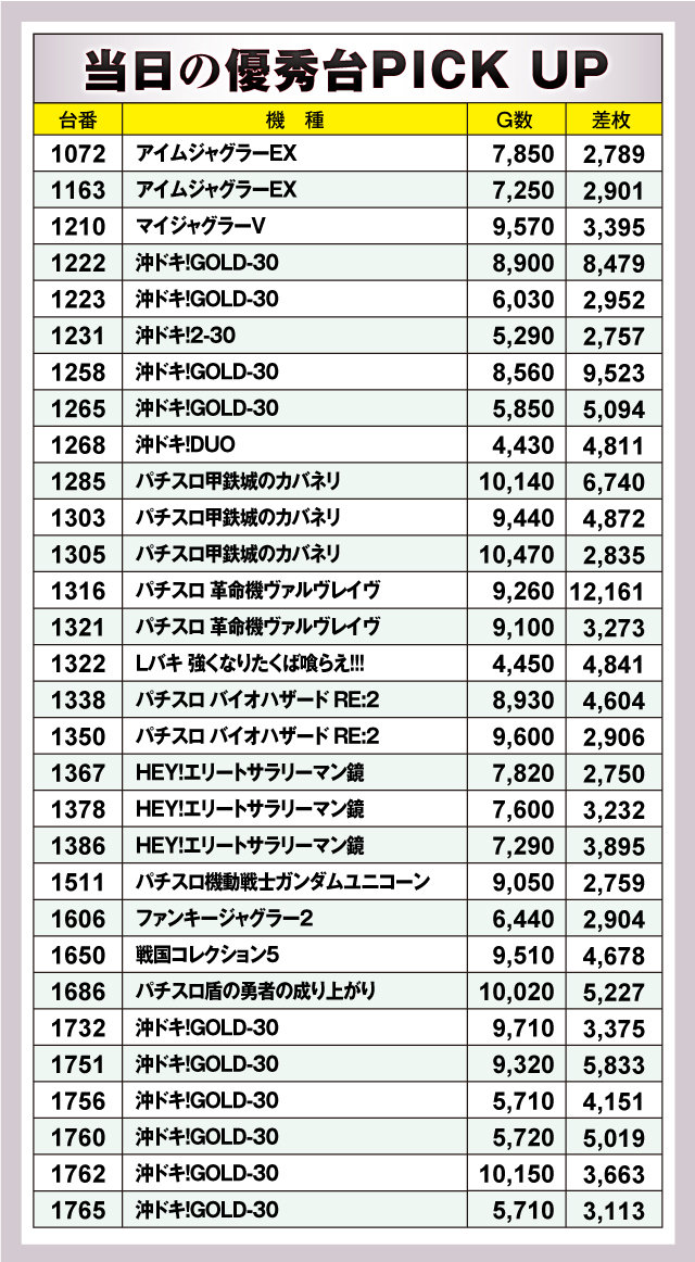 まずは優秀30台のPICK UPから。この日は30台全てが+2,000枚を超える盛況ぶりで、もっとも高い差枚数だったのは、1316番台の「パチスロ 革命機ヴァルヴレイヴ」で、驚きの+12,161枚と圧倒的プラス! その他も沖スロシリーズやジャグラーシリーズ、スマスロや6.5号機等のハイスペック機種など、多種多様な機種が活躍していた。