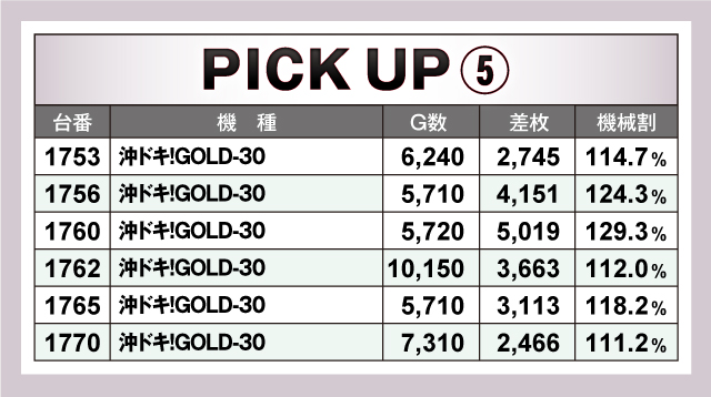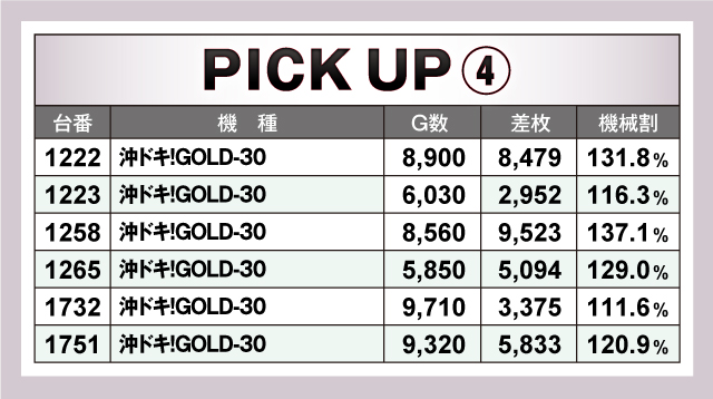続いては当日好調だった6箇所4機種について。どの箇所も素晴らしい成績を残していたが、とくに注目して欲しいのは、「沖ドキ!GOLD-30」の活躍ぶりだ。ピックアップした6台のアベレージは+5,876枚と群を抜いて素晴らしく、平均G数も申し分のない数値だったことからも、楽しめる要素はふんだんに用意されていた可能性が高い。今後も要チェックするべし!