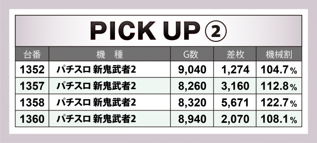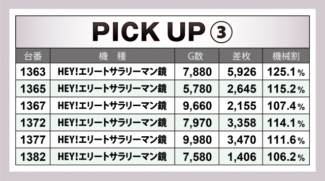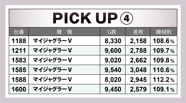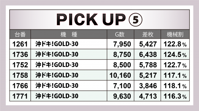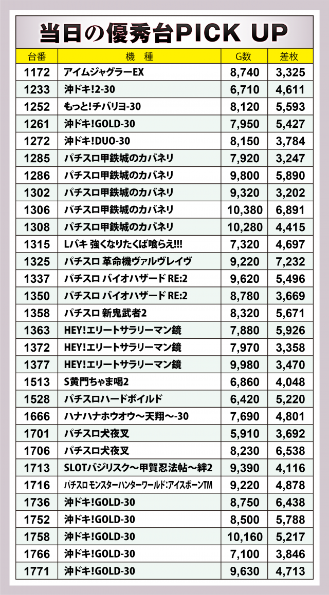続いては当日好調だった5機種28台をチェック。全ての台が4桁以上の差枚数を成し遂げる中、特に優れていたのが『沖ドキ!GOLD-30』。+6千枚×1&+5千枚超×3で6台の合計が+3万枚オーバーを達成。 次いで『HEY!エリートサラリーマン鏡』6台と『パチスロ 新鬼武者2』4台はどちらも1台あたりの平均が+3千枚弱超というハイレベルぶり。また『マイジャグラーⅤ』では全ての台が+2千枚以上の差枚数という結果を残した。