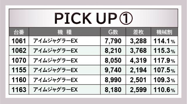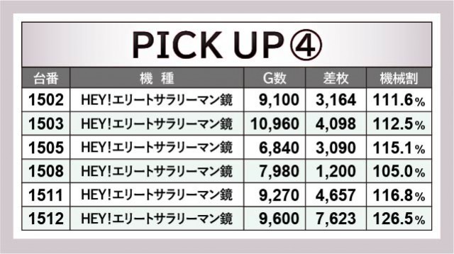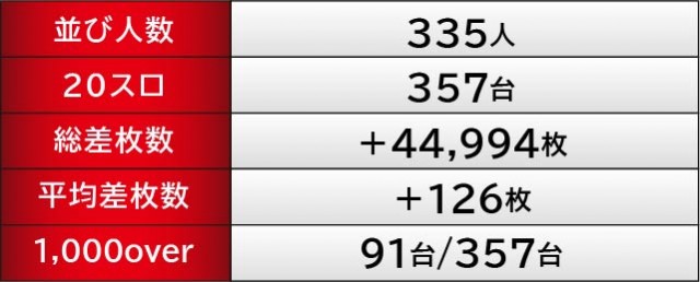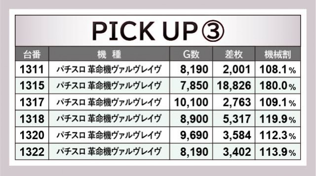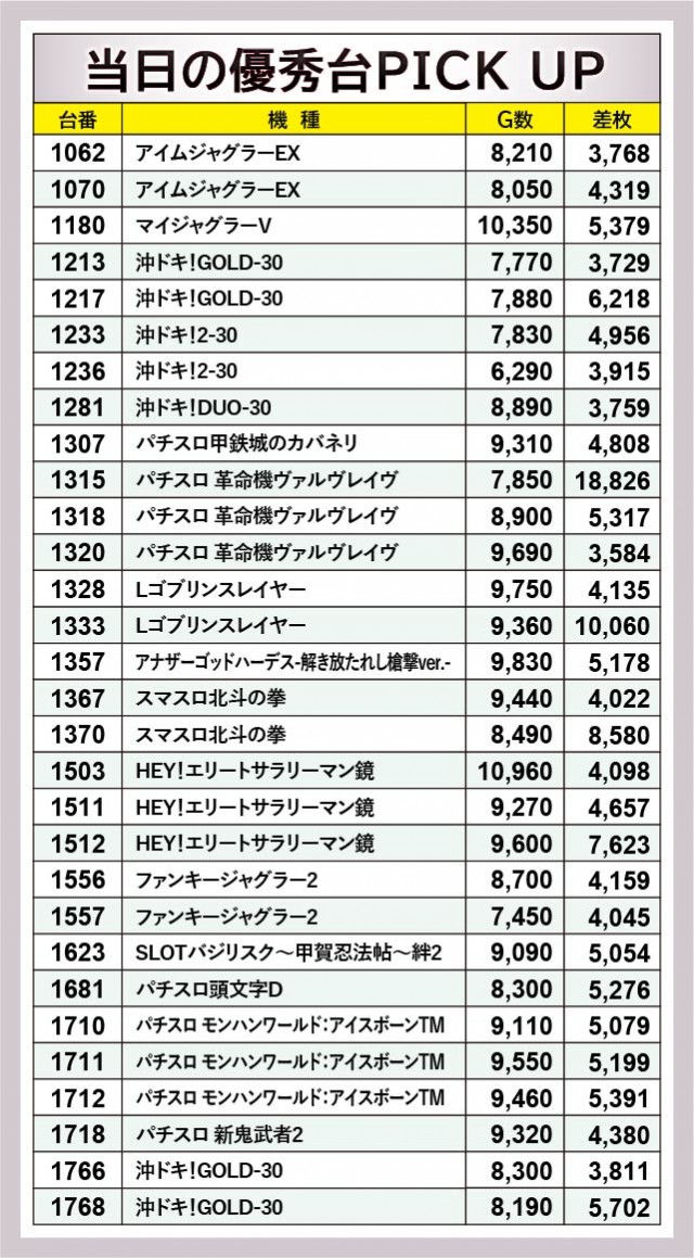 前述したように、当日はスマスロ勢の活躍が目覚ましかった。『パチスロ 革命機ヴァルヴレイヴ』1315番台+18,826枚は圧倒的なインパクトを残し、他にも1318番台+5,317枚という大台を突破する台が見られるなど、同機種のポテンシャルに目を奪われるばかりだ。また『HEY!エリートサラリーマン鏡』も1512番台+7,623枚を筆頭に、1503番台+4,098枚・1511番台+4,657枚と、こちらも大台突破台が目立っていた。スマスロ勢の高いポテンシャルが発揮され、今後とも同機種群には注目する必要がありそうだ。
