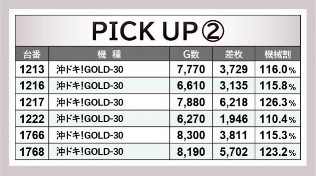『アイムジャグラーEX』は多くの台が朝からじっくりと打ち込まれており、その中で優秀な結果を残した台を6台ピックアップした。1070番台+4,319枚を筆頭に、2台の3千枚OVERが発生するなど、コンスタントな大当りによってファンを笑顔にしていたはずだ。また『沖ドキ!GOLD-30』では1217番台+6,218枚・1768番台+5,702枚といった記録が生まれ、ハイビスカスが煌びやかに輝いていたのも見逃せない。