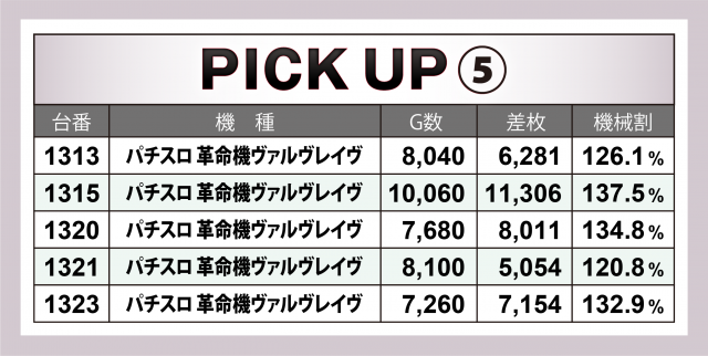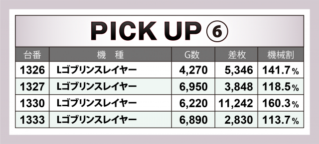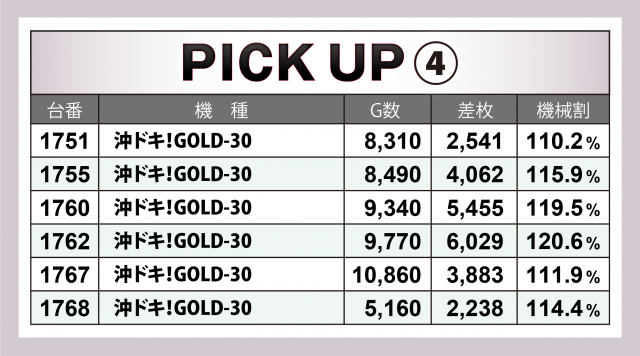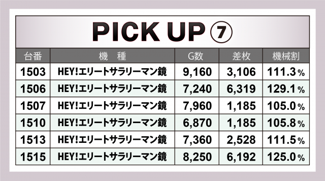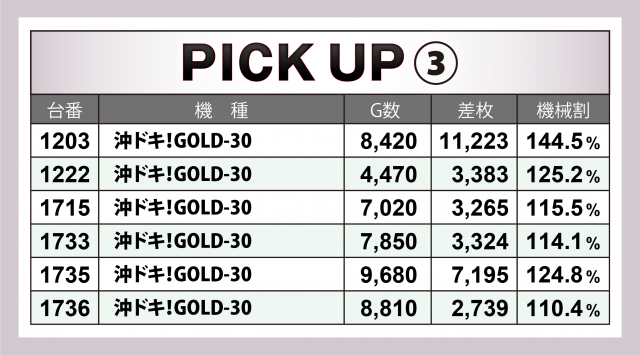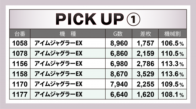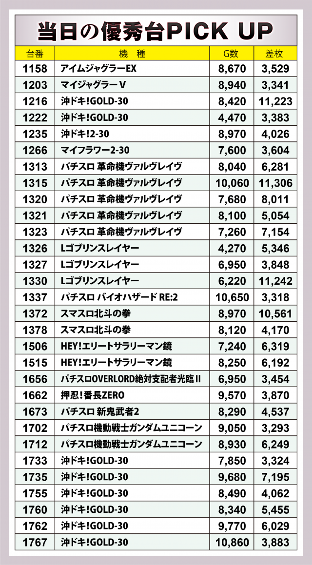 まずは優秀30台のPICK UPから。なんと30台全てが差枚数+3千枚以上を達成、+4千枚以上は全体の3分の2弱となる19台、+5千枚オーバーは全体の半数となる15台、+6千枚オーバーは全体の3分の1強となる12台、そしてなんと万枚オーバーが4台となる高水準ぶりを見せつけた。