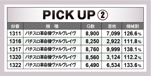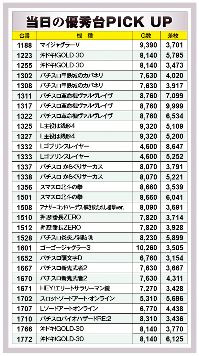 まずは優秀30台PICK UPから。30台全てが差枚数+3千枚以上を達成し、+4千枚以上は16台、+5千枚オーバーは13台、+5千枚オーバーは6台となった。